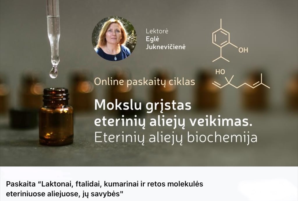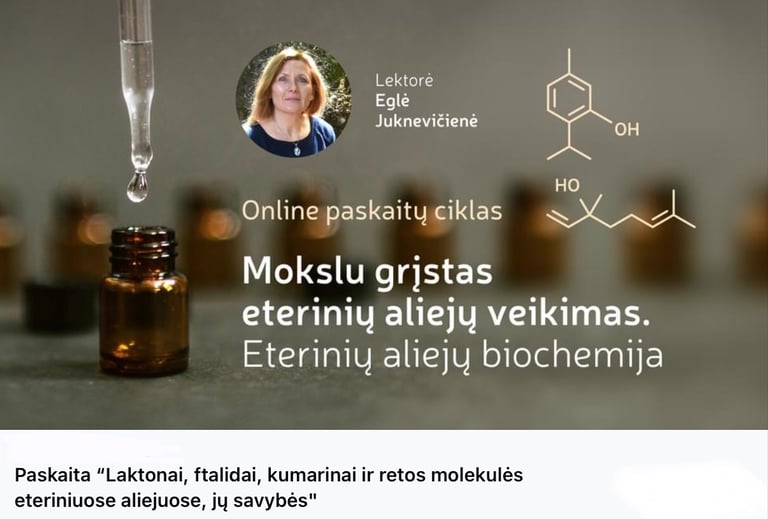 “Laktonai, ftalidai, kumarinai ir retos molekulės eteriniuose aliejuose, jų savybės ir naudojimas” - aštunta paskaita iš ciklo "Eterinių aliejų biochemija - kelias į kvapų terapijos pažinimą"
