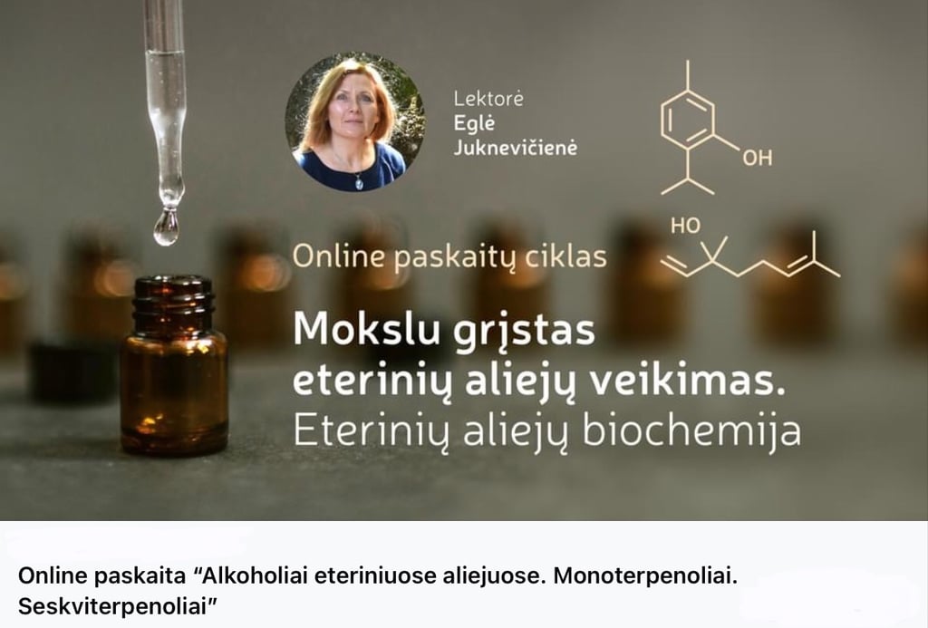 Paskaitos metu nagrinėsime profesionalių aromaterapeutų ir aromatologijos farmakologų receptus, kuriuose naudojami monoterpenoliai ir seskviterpenoliai, aiškinsimės, kaip derinamos tarpusavyje eterinių aliejų savybės.
